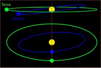 Dans la plupart des cas, lorsque Vénus et la Terre sont en conjonction, elles ne sont pas alignées avec le Soleil. L'orbite de Vénus est inclinée de 3,4° par rapport à celle de la Terre et passe donc en dessous (ou au-dessus) du Soleil dans le ciel[3]. Observée depuis la Terre, Vénus en conjonction inférieure peut être écartée jusqu'à 9,6° du Soleil bien que l'inclinaison ne soit que de 3,4°. Comme le diamètre angulaire du Soleil est d'environ 1/2 degré, Vénus passe alors au-dessus ou en dessous du Soleil à plus de 18 diamètres solaires[3]. Le transit advient quand les deux planètes sont en conjonction au moment (ou presque au moment) où elles croisent la ligne d'intersection de leurs plans orbitaux.