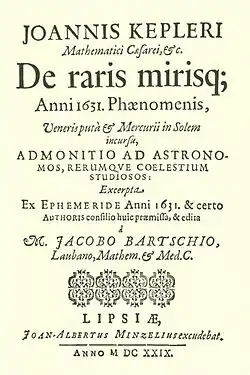En 1619, Kepler publie ses tables rudolphines. Dix ans plus tard, il en publie des extraits dans De raris mirisque anni 1631 phaenomenis qui inclut une admonitio ad astronomos (« avertissement aux astronomes ») à propos du transit de Mercure en 1631 et des transits de Vénus en 1631 et 1761. Le transit de Mercure est observé comme prévu par Jean-Baptiste Cysat à Innsbruck, Remus Quietanus à Rouffach[3] et Pierre Gassendi à Paris, justifiant l'approche de Kepler[1]. Toutefois, leurs observations remettent en question les théories sur le système solaire, Mercure étant observé nettement plus petit qu'attendu[4], suggérant que l'observation d'un transit de Vénus serait plus utile scientifiquement[5].