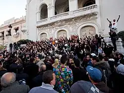 Pendant six semaines, la tension et les affrontements se prolongent, avec notamment des manifestations qui prennent pour cible le gouvernement Ghannouchi, qui refuse les revendications des manifestants et de différents organismes issus de la révolution, dont la principale est la convocation d’une assemblée constituante, à quoi s’ajoutent selon les tendances la démission du Premier ministre Ghannouchi, la dissolution définitive du Parlement et des commissions d’enquête post-révolutionnaires, une forte épuration judiciaire des magistrats bénalistes ou la demande d’extradition de Ben Ali pour haute trahison. Les manifestants, plusieurs milliers, occupent les kasbahs de Tunis et Sfax à partir du 21 février[88],[89], à l’appel notamment du Conseil national pour la protection de la révolution. Ils obtiennent gain de cause le 27 février, avec une manifestation de 100 000 personnes à Tunis qui pousse à la démission le Premier ministre, remplacé par Béji Caïd Essebsi, plusieurs fois ministre sous la présidence de Habib Bourguiba. Ce nouveau tour de force contestataire coûte cinq morts et 88 manifestants arrêtés[90],[91].