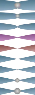 - la sphère continue de rétrécir jusqu'à ne plus être qu'un point, la structure de l'espace-temps est « pincée »,