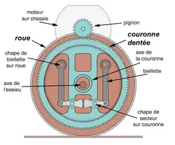 Le moteur, placé au-dessus de l'essieu, fixé au châssis, entraîne par un pignon une couronne dentée (de taille légèrement inférieure à la roue) située en porte-à-faux à l'extérieur des roues de l'essieu et supportée par une pièce rigide au châssis. Le voile de la roue possède deux manetons qui sont reliés à la couronne dentée par deux biellettes articulées rendues solidaires par deux secteurs dentés qui se font face. Les variations de distance entre les points d'attache sur la roue et sur la couronne dentée lors des mouvements (essentiellement verticaux) de l'essieu sur la voie sont pris en charge par la rotation des secteurs dentés. Les articulations sphériques des biellettes autorisent également le jeu transversal des essieux lors de leur inscription en courbe.