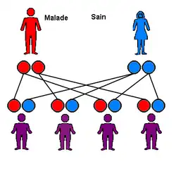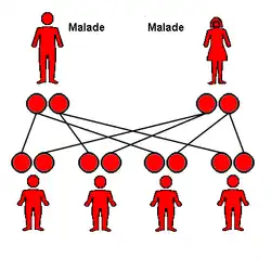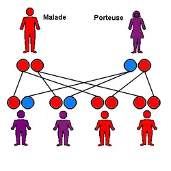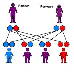 Dans les schémas, les gamètes porteurs de l'allèle normal (sauvage) sont en bleu, les gamètes porteurs de l'allèle anormal sont en rouge. Les personnes porteuses du gène anormal sur deux allèles (et donc susceptible de développer la maladie) sont en rouge, les personnes porteuses du gène anormal sur un seul allèle (dites porteuses saines ou conductrices) sont en violet, les personnes non porteuses du gène anormal sont en bleu.