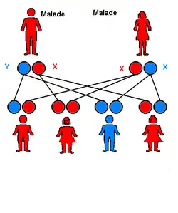 - toutes les filles seront malades, car leur père leur transmet obligatoirement le X, porteur de la maladie.