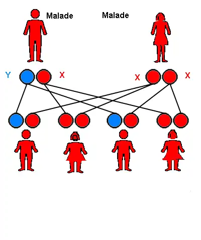 - La mère malade transmet un de ses gènes X à ses fils, qui sera leur unique chromosome X. Ses fils seront donc malades dans 50 % des cas (s'ils héritent du chromosome X contenant la mutation) car hémizygote.
