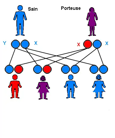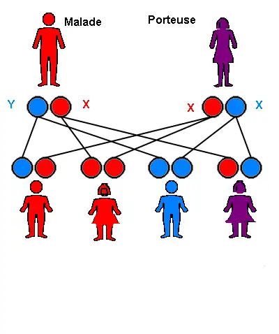 Dans les schémas les gamètes porteuses de l'allèle normal (dit sauvage) sont bleues, les gamètes porteuses de l'allèle mutant sont rouges. Les personnes malades sont rouges, les femmes non malades mais porteuse d'un allèle mutant (hétérozygote) sont violettes, les personnes non porteuse de la mutation (homozygote sauvage) sont bleues