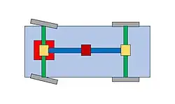 - un différentiel par paire de roues motrices[19] : cet organe mécanique, parfois appelé "pont", assure d'une part un renvoi d'angle, et d'autre part la possibilité pour les roues de tourner à des vitesses différentes[20] ;