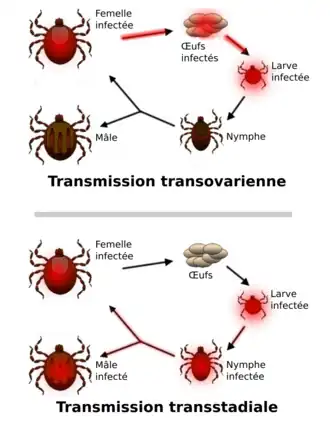Par exemple, l'agent causal de la maladie de Lyme, Borrelia burgdorferi (espèce de bactéries), infecte la tique-vectrice lorsque celle-ci est au stade larvaire, et l'infection se maintient lorsque la larve mue en nymphe et passe plus tard au stade adulte[2]. Ce type de transmission est observé chez d'autres parasites comme les virus ou les Rickettsia[3]. Outre les tiques, d'autres acariens sont des vecteurs courants à transmission transstadiale[1],[4]. Certains auteurs considèrent la transmission transstadiale comme un type de transmission horizontale[5],[6], alors que d’autres la considèrent comme une transmission verticale ou partiellement verticale[7],[8].