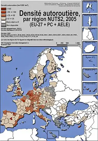 - Un pays européen moyen disposait en 2005 de 59 205 km d'autoroutes (soit en moyenne 14 km pour 100 000 hbts et 18 km/1000 km2) alors que le reste du réseau routier représentait 3 371 760 km de routes (soit en moyenne 1 221 km pour 100000 hbts et 1 075 km/1000 km2[1]), avec de fortes variations liées à la taille du pays ou de la région, mais aussi à sa densité de population et au niveau d'industrialisation (actuel ou passé) du territoire.