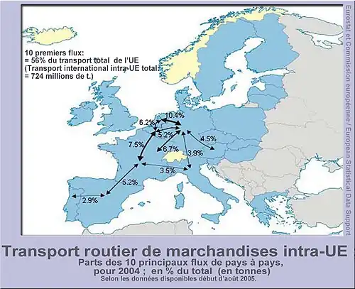 - ↑ Eurostat, Aspects spécifiques du transport routier de marchandises 1999 - 2003, Fin de rédaction: 21.01.2005 ; (ISSN 1562-1316) ; Numéro de catalogue: KS-NZ-05-001-FR-N, réusage autorisé en citant la source