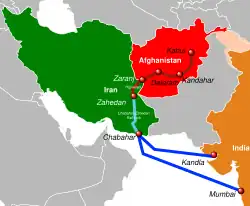 L'Inde et l'Afghanistan travaillent à l'extension de cette route ferroviaire d'Hérat à Mazâr-e Charîf[37]. Mazâr-e Charîf est déjà relié à l'Ouzbékistan et au Tadjikistan par des voies ferroviaires[37]. Hérat est également déjà reliée au Turkménistan par des voies ferroviaires et routières. L'Inde finalise également un projet de construction d'un chemin de fer de 900 kilomètres qui reliera le port de Tchabahar en Iran, en cours de construction avec l'aide de l'Inde, à la région minière de Hajigak (en) en Afghanistan[38],[39]. Dès 2011, sept sociétés indiennes ont acquis les droits d'exploitation minière de la région. Le gouvernement indien s'est engagé à financé à hauteur de 2 milliards de dollars le développement des infrastructures[40].