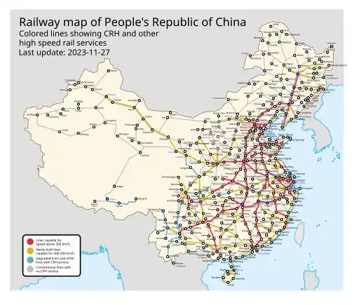 Le réseau chinois à grande vitesse est, en , le premier au monde[2] après des investissements de plus de 2 100 milliards de dollars ($) depuis 1990 et l'importation des technologies à grande vitesse venues de France (Alstom), du Canada (Bombardier), de Suède, de Suisse, d'Allemagne (Siemens) et du Japon.