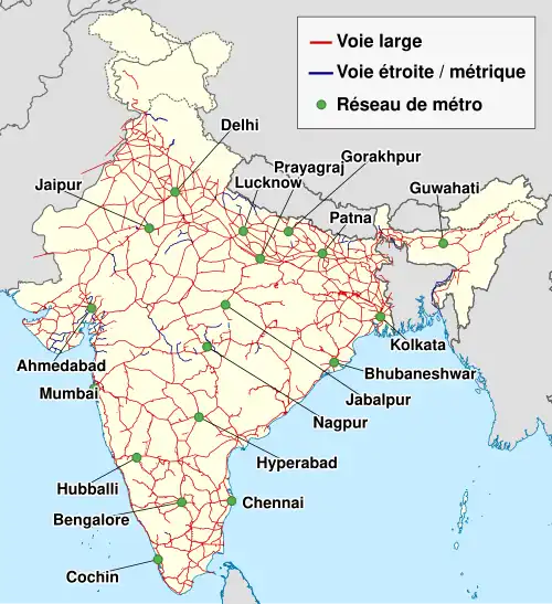 En plus du réseau ferroviaire national, il existe plusieurs réseaux de métro dans les plus grandes villes du pays. Le métro est ainsi présent à Chennai (Madras), Delhi, Kolkata (Calcutta) et Mumbai (Bombay).