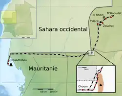 En partant de l'océan, en allant d'ouest en est, la voie ferrée suit la frontière entre la Mauritanie et le Sahara occidental, jusqu'à Choum puis remonte vers le nord. Avant 1978, elle traversait la montagne Choum par un tunnel, mais celui-ci est maintenant fermé et le terrain est difficile. Actuellement, elle contourne ce passage en pénétrant sur 5 km dans le territoire du Sahara occidental[1].