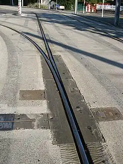 À plusieurs endroits de la ligne, on trouve des « triangles d'insertion » permettant d'engager le galet de guidage sur le rail[48] : aux terminus « sud » de chaque ligne, juste avant le quai de départ, à la station Maréchal Juin (ligne A) sur une voie dédiée, à Château d'Eau (ligne B) sur une voie dédiée pour les rames sortant du dépôt, dont l'accès nécessite de se déguider et de passer en mode Diesel, après la station Cité U Lébisey (Ligne B) en direction d'Hérouville et sur le tronc commun à hauteur des stations Université, Saint-Pierre et Gare SNCF, toutes les trois orientés en direction du sud.