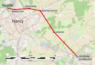 Pour ce faire, et afin de contourner la ville de Nancy et l'aérodrome d'Essey-lès-Nancy, la ligne se dirige d'abord globalement vers l'est, franchissant le plateau de Malzéville et la butte Sainte-Geneviève (butte-témoin à l'extrémité sud-est du plateau de Malzéville) puis s'incurve en direction du sud après Essey vers Lenoncourt puis Dombasle. Outre les reliefs, la ligne franchit de nombreux obstacles : Meurthe, canal de la Marne au Rhin, deux voies ferrées, dix-sept routes, vingt-trois chemins et six agglomérations (Maxéville, Malzéville, Dommartemont, Essey-lès-Nancy, Pulnoy et Varangéville)[7]. Du fait du détour effectué, elle parcourt dix-huit kilomètres[8].