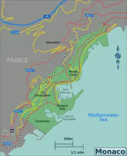Cinquante kilomètres de voirie urbaine existent. Cette voirie est reliée à l'autoroute A8 qui contourne (ou longe) la Principauté par le nord. Pour gagner quelques hectares et fluidifier la circulation, la principauté enterre ses voies rapides, et principalement l'axe dénommé « dorsale » qui traverse Monaco d'ouest en est, et dont la partie Est encore en travaux est principalement enterrée[3]. Les travaux auront coûté 180 millions d'euros et leur fin est prévue en 2010[4].