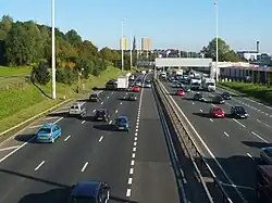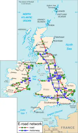Les routes majeures comprennent les autoroutes (anglais : motorway) et les routes nationales (anglais : trunk roads).