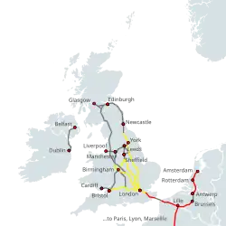 - Ligne à grande vitesse : 108 km (dont 34 en construction) : Channel Tunnel Rail Link (CTRL) entre Folkestone et Londres.
