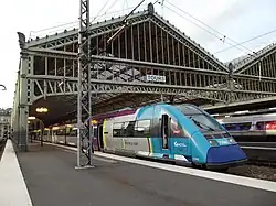 | Ligne de Tours à Saint-Nazaire | Double voie électrifiée en courant alternatif 25 kV 50 Hz (sauf les 8 premiers kilomètres électrifiés en courant continu 1500 V), ouverte aux trafics de fret et de voyageurs. Un raccordement permet de relier cette ligne à celle vers Paris sans rebroussement à Tours. |