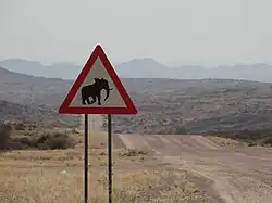 Un panneau routier sur la piste C39 près de Khorixas, dans le Damaraland. La lettre C correspond aux routes du réseau secondaire. Si certaines sont asphaltées, la plupart sont des routes de gravier. Elles sont numérotées de C10 à C46.