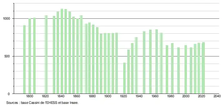 L'évolution du nombre d'habitants est connue à travers les recensements de la population effectués dans la commune depuis 1793. Pour les communes de moins de 10 000 habitants, une enquête de recensement portant sur toute la population est réalisée tous les cinq ans, les populations de référence des années intermédiaires étant quant à elles estimées par interpolation ou extrapolation[24]. Pour la commune, le premier recensement exhaustif entrant dans le cadre du nouveau dispositif a été réalisé en 2006[25].
