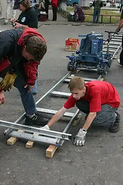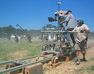 On installe la caméra et le ou les opérateurs sur un chariot que poussent les machinistes soit sur rails tubulaires nivelés par des cales sur un terrain accidenté, soit sur des pneumatiques haute pression sur terrain plat ou aplani par des plaques de contreplaqué. Le chariot peut porter une colonne centrale entourée de bras réglables et repliables (Spyder) qui accepte l'opérateur assis, permettant des ajustements verticaux. Un pied à roulettes (pied boule) sur le sol lisse d'un studio permet dans une certaine mesure le déplacement pendant l'enregistrement.