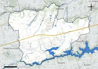Trois plans d'eau complètent le réseau hydrographique : le plan d'eau du le barrage de la Chèze, d'une superficie totale de 158,1 ha (53,77 ha sur la commune), l'étang de l'Etunel, d'une superficie totale de 1,7 ha (0,45 ha sur la commune) et l'étang du Gué Charet, d'une superficie totale de 0,8 ha (0,58 ha sur la commune)[Carte 1],[11].
