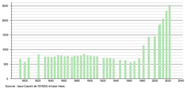 L'évolution du nombre d'habitants est connue à travers les recensements de la population effectués dans la commune depuis 1793. Pour les communes de moins de 10 000 habitants, une enquête de recensement portant sur toute la population est réalisée tous les cinq ans, les populations de référence des années intermédiaires étant quant à elles estimées par interpolation ou extrapolation[32]. Pour la commune, le premier recensement exhaustif entrant dans le cadre du nouveau dispositif a été réalisé en 2007[33].