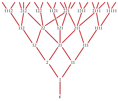 Pour trouver la borne inférieure de deux sommets x et y, on procède comme suit. On teste d'abord si l'un est descendant de l'autre. Cela se produit exactement lorsque le nombre de « 2 » restant dans y après avoir supprimé le plus long suffixe commun de x et y est au moins aussi grand que le nombre de total de chiffres qui restent de x après avoir supprimé ce suffixe commun. Par exemple, 1121 est un descendant de 11, parce que, après suppression du suffixe commun, 112 contient exactement un « 2 » qui est la longueur de la suite 1. En revanche, 1121 n'est pas descendant de 111. Si aucun des sommets x et y n'est descendant de l'autre et si l'une des deux suites commence par des chiffres « 1 », leur borne inférieure est inchangée si l'on supprime ces chiffres initiaux. Si les deux suites commencent par un « 2 », on trouve la borne inférieure en supprimant dans les deux suites ce chiffre initial, calculant la borne inférieure des suites restantes puis de remettre le « 2 » en tête du résultat. Par exemple, le calcul de la borne inférieure de mène d'abord à