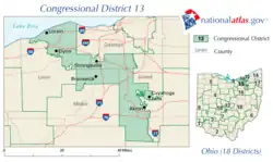 Le 13e district congressionnel de l'Ohio est représenté par la Démocrate Emilia Sykes. En raison de la redistribution à la suite du recensement des États-Unis de 2010, l'Ohio a perdu ses 17e et 18e districts, ce qui a nécessité un redessinage des limites des districts. À la suite des élections de 2012, le 13e district a été modifié pour englober une grande partie du territoire de l'ancien 17e district, y compris la ville de Youngstown et les zones à l'est d'Akron.