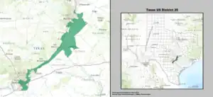 Le district comprend des parties de la zone métropolitaine de San Antonio (principalement des zones à majorité noire et hispanique), y compris des parties du Comté de Bexar, de fines bandes des comtés de Comal et Hays, une partie du Comté de Caldwell et des parties du sud et de l'est d'Austin dans le Comté de Travis[4].