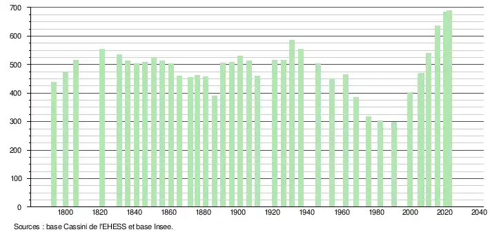 L'évolution du nombre d'habitants est connue à travers les recensements de la population effectués dans la commune depuis 1793. Pour les communes de moins de 10 000 habitants, une enquête de recensement portant sur toute la population est réalisée tous les cinq ans, les populations de référence des années intermédiaires étant quant à elles estimées par interpolation ou extrapolation[20]. Pour la commune, le premier recensement exhaustif entrant dans le cadre du nouveau dispositif a été réalisé en 2005[21].