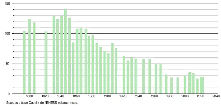 L'évolution du nombre d'habitants est connue à travers les recensements de la population effectués dans la commune depuis 1793. Pour les communes de moins de 10 000 habitants, une enquête de recensement portant sur toute la population est réalisée tous les cinq ans, les populations de référence des années intermédiaires étant quant à elles estimées par interpolation ou extrapolation[27]. Pour la commune, le premier recensement exhaustif entrant dans le cadre du nouveau dispositif a été réalisé en 2005[28].
