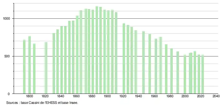 L'évolution du nombre d'habitants est connue à travers les recensements de la population effectués dans la commune depuis 1793. Pour les communes de moins de 10 000 habitants, une enquête de recensement portant sur toute la population est réalisée tous les cinq ans, les populations de référence des années intermédiaires étant quant à elles estimées par interpolation ou extrapolation[17]. Pour la commune, le premier recensement exhaustif entrant dans le cadre du nouveau dispositif a été réalisé en 2007[18].