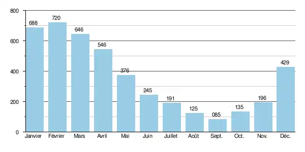 Les crues peuvent être importantes, du moins proportionnellement au bassin versant fort exigu de la rivière. Les QIX 2 et QIX 5 valent en effet respectivement 3,8 et 5,6 m3. Le QIX 10 est de 6,7 m3/s et le QIX 20 de 7,9 m3. Quant au QIX 50, il se monte à 9,3 m3/s.