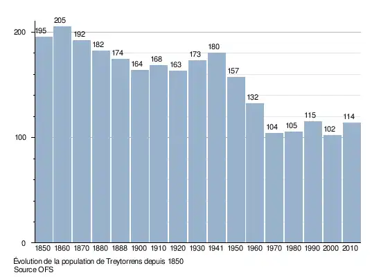 La population de Treytorrens est de 195 habitants en 1850 et reste relativement stable jusqu'en 1941. Elle baisse jusqu'à 104 habitants en 1970 avant une nouvelle période stable. Le graphique suivant résume l'évolution de la population de Treytorrens entre 1850 et 2010[15] :