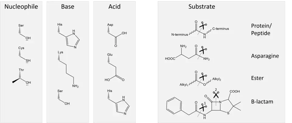 Les principaux nucléophiles enzymatiques sont l'hydroxyle OH du groupe alcool de la sérine et le sulfhydryle SH du groupe thiol ou de l'ion thiolate S− de la cystéine. Inclure ces nucléophiles dans une triade catalytique accroît leur activité. Quelques peptidases utilisent l'alcool secondaire de la thréonine ; cependant, en raison de la présence d'un groupe méthyle supplémentaire, ces peptidases utilisent l'amide N-terminale comme base plutôt qu'un autre résidu d'acide aminé[3],[5].