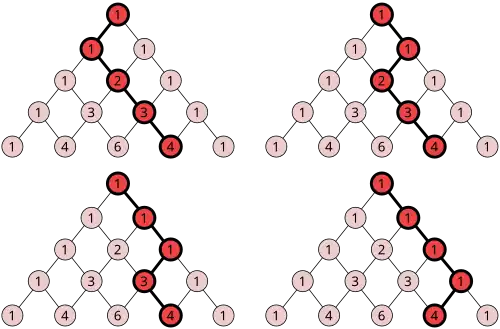 Imaginons que chaque nombre dans le triangle est un nœud dans un réseau qui est connecté aux nombres adjacents du dessus et du dessous. Maintenant pour n'importe quel nœud dans le réseau, comptons le nombre de chemins qu'il y a dans le réseau (sans faire une marche arrière) qui connecte ce nœud au nœud supérieur du triangle. La réponse est le nombre de Pascal associé à ce nœud.