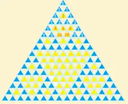 Les nombres situés sur la troisième diagonale descendante correspondent aux nombres triangulaires, ceux de la quatrième diagonale aux nombres tétraédriques, ceux de la cinquième diagonale aux nombres pentatopiques et ceux de la n-ième diagonale aux nombres n-topiques.