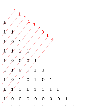 Lorsque le triangle est disposé comme dans la figure ci-contre à gauche (au lieu d'être symétrique par rapport à une verticale), la somme des termes des diagonales de pente 1 forme la suite de Fibonacci. Si, au lieu d'en faire la somme, on compte le nombre de coefficients impairs sur ces diagonales, on obtient la suite diatomique de Stern (figure de droite).
