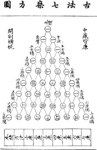 La tradition occidentale attribue le nom de triangle de Pascal au triangle décrit plus haut. Cependant, ce triangle était déjà connu en Orient et au Moyen-Orient plusieurs siècles avant la publication de Blaise Pascal. Il était ainsi connu des mathématiciens persans, par exemple al-Karaji (953-1029)[1] ou Omar Khayyam au XIe siècle ou des mathématiciens du Maghreb comme Ibn al-Banna[2] et ses disciples qui l'utilisent pour développer (a + b)n. Il apparaît en Chine dès 1261 dans un ouvrage de Yang Hui (au rang 6) et dans le Miroir de jade des quatre éléments de Zhu Shijie en 1303 (au rang 8). Yang Hui attribue la paternité du triangle au mathématicien chinois du XIe siècle Jia Xian. Ce triangle permettait de présenter les coefficients des différents termes dans la formule du binôme et, selon Victor J. Katz, il était utilisé pour généraliser à des degrés supérieurs à 2 la méthode d'extraction de racine[3].