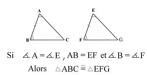 Deux triangles sont isométriques lorsqu'ils ont un côté de même longueur compris entre deux angles homologues de mêmes mesures.