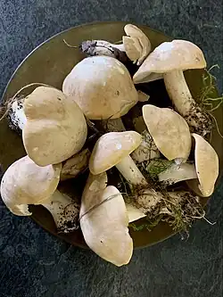 - Melanoleuca strictipes et son groupe d'espèces, au chapeau blanc déprimé à maturité avec un mamelon léger, odeur pharmaceutique, lames blanche.