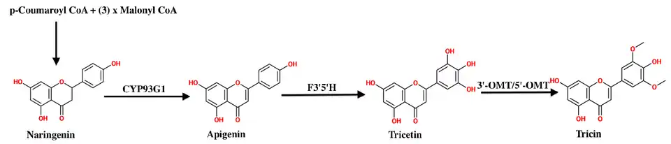 Si la biosynthèse totale des flavones n'a pour l'instant pas été identifiée complètement, la plupart des étapes du mécanismes ont elles été identifiées et étudiées. La première partie de la biosynthèse de la tricine inclut l'addition de malonyl-CoA, produit par la voie des polycétides, et de p-coumaroyl-CoA produit par la voie des phénylpropanoïdes[5]. Cette série des réactions est biocatalysées par les actions successives de la chalcone synthase et de la chalcone isomérase, pour former la naringinine chalcone (en), puis la flavanone naringinine. CYP93G1, une hémoprotéine de la famille des CYP450 désaturate ensuite la naringinine en apigénine. À ce stade, il a été proposé qu'une enzyme, la flavonoïde 3'5'-hydroxylase (F3’5’H), catalyse la transformation de l'apigénine en tricétine[6]. Enfin, cette dernière subit l'action de la 3'-O-méthyltransferase et de la 5’-O-méthyltransferase qui ajoute des groupes méthoxy pour former la tricine.