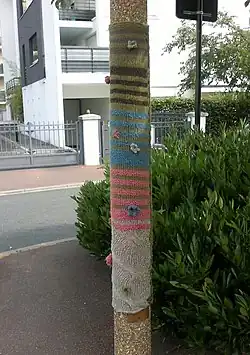 - À Évry, la maison de quartier des Aunettes a organisé, de mai à , une action collective de « tricot-graffiti » en collaboration avec Christine Chazot (« sicilienne »[7] sur le site Ravelry.com), intervenante, les enfants de l'École Conté, les volontaires du quartier, des participants de l'ADAPT [8]. Cette action, d'ampleur internationale grâce aux dons de fils et d'ouvrages crochetés et tricotés venant de donateurs étrangers (Suisse, Belgique, Angleterre, États-Unis, Canada, Japon…) contactés sur Ravelry, a permis d'habiller, sur 3 thèmes (« rayures », « dentelles », « hippie ») plusieurs dizaines d'objets urbains (poteaux, barrières, grilles, arbres[9].