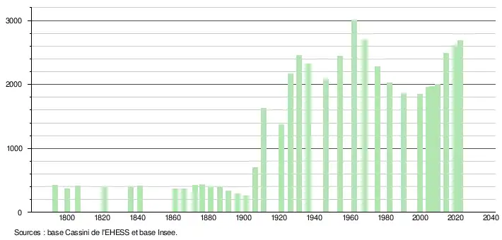 L'évolution du nombre d'habitants est connue à travers les recensements de la population effectués dans la commune depuis 1793. Pour les communes de moins de 10 000 habitants, une enquête de recensement portant sur toute la population est réalisée tous les cinq ans, les populations de référence des années intermédiaires étant quant à elles estimées par interpolation ou extrapolation[28]. Pour la commune, le premier recensement exhaustif entrant dans le cadre du nouveau dispositif a été réalisé en 2004[29].