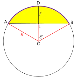 - Flèche d’une corde sous-tendant l’arc d'angle au centre : soit le milieu de , et le rayon passant par ; alors la flèche correspondante est :