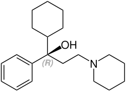 Trihexyphenidyl contient un stéréocentre et se compose donc de deux énantiomères. Pratiquement c'est le racémique, c'est-à-dire le mélange 1:1 des formes (R) et (S) qui est utilisé[2] :