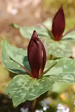 Cette plante originaire du sud-est des États-Unis fleurit au printemps dans les forêts de pente montagnardes fraîches sur sol surtout calcaire. Les pétales de 3 à 6 cm sont de couleur variable : verdâtres, jaunâtres, pourpre, marron, parfois bicolores. Les feuilles ovales acuminées ont des taches très marquées, qui pâlissent avec l’âge. Le fruit est une baie verte à lignes pourpres.