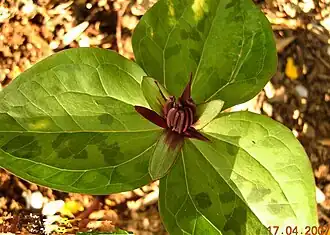 Cette plante originaire du sud-est des États-Unis fleurit au printemps dans les forêts alluviales et le long des rivières en sol calcaire. Les pétales lancéolés, contournés et étalés – caractéristique de cette espèce – de 1,5 à 4 cm à odeur de charogne sont marron ou pourpres. Les étamines pourpres sont apparentes. Les feuilles ovales-lancéolées ont des taches argentées peu marquées dans leur jeunesse. Le fruit est une baie pourpre.